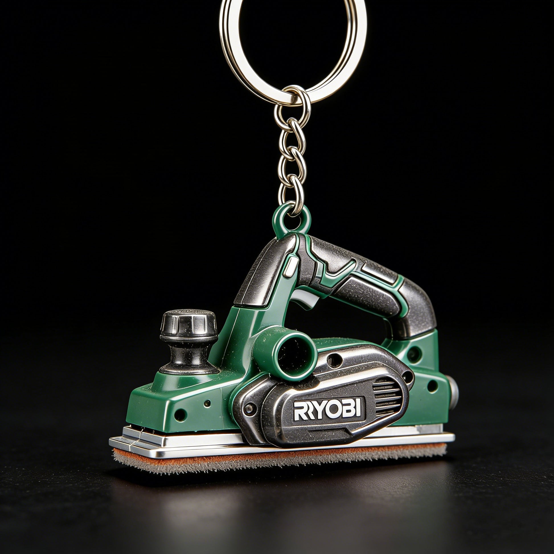 This intricately designed keychain captures the iconic form and details of a RYOBI sander, complete with realistic contours, vents, and the brand's signature green finish. A true miniature tribute to power tool excellence.